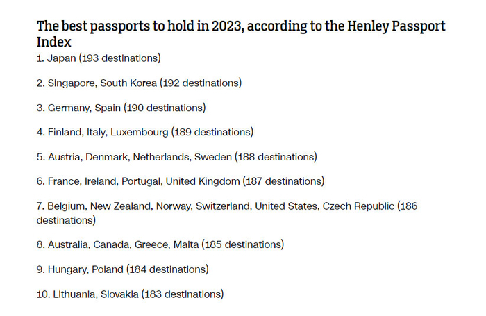 10일(현지시간) 미국 CNN 방송에 따르면 영국 런던에 있는 국제교류 자문 업체 '헨리앤드파트너스'는 이날 공개한 2023년 1분기 세계 이동성 보고서에서 이같이 밝혔습니다. 이 업체는 국제항공운송협회(IATA) 자료를 토대로 각국의 '여권 파워'를 평가한 결과를 분기별로 공개해 왔습니다.