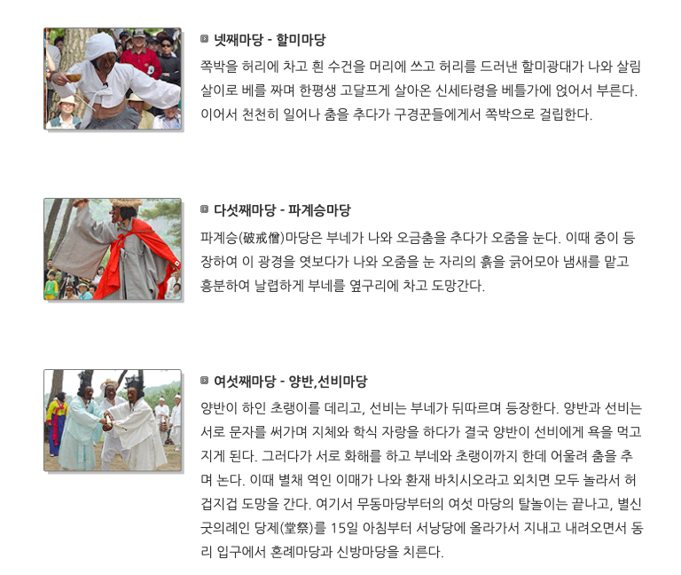 무동 마당 ▶︎ 주지 마당 ▶︎ 백정 마당 ▶︎ 할미 마당 ▶︎ 파계승 마당 ▶︎ 양반·선비 마당