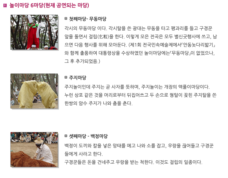 원래 놀이마당은 무동마당 ▶︎ 주지마당 ▶︎ 백정마당 ▶︎ 할미마당 ▶︎ 파계승마당 ▶︎ 양반·선비마당 ▶︎ 혼례마당 ▶︎ 신방마당의 8마당으로 구성되어 있다.