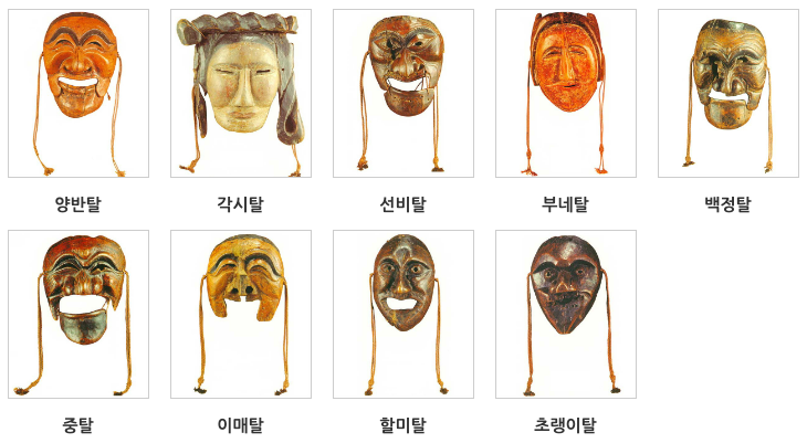 주지승, 각시, 중, 양반, 선비, 초랭이, 이매, 부네, 백정, 할미