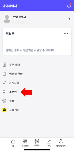 2 '마이페이지'에서 '추천인' 를 클릭합니다.