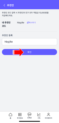 5 '내 추천인 코드'를 입력하였다면 '확인'버튼을 클릭합니다.