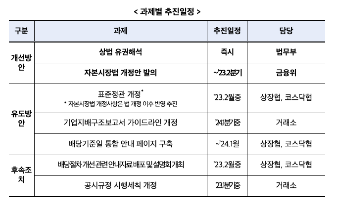 코리아디스카운트 요인 중 하나인 배당절차를 글로벌 스탠더드에 부합하도록 개선하기로 하였습니다. 배당액이 확정된 이후에 배당을 받을 주주가 결정될 수 있도록 개선안을 정책화 하였습니다. 즉, '선배당확정 후배당기준일' 자본시장법을 개정할 예정입니다. 빠를 경우 '24년부터 ('23년 결산배당) 개선된 절차를 적용할 수 있습니다. 분기배당에 대한 자본시장법 개정안은 2분기 중 발의할 예정입니다. 기업지배구조보고서 가이드에 실릴 배당절차는 2024년 1분기 중 개정하여 배포할 계획입니다. 배당절차 개선은 상법 개정안이 필요한 사안입니다.