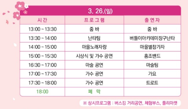 개막식, 벚꽃길 포토존, 공연, 플리마켓, 푸드트럭, 마을노래자랑, 버스킹 거리공연