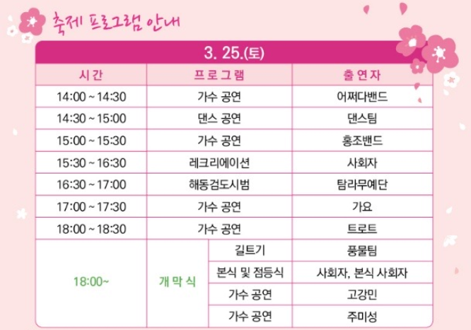 축제의 개막식은 3.25.(토) 오후 6시에 있습니다.