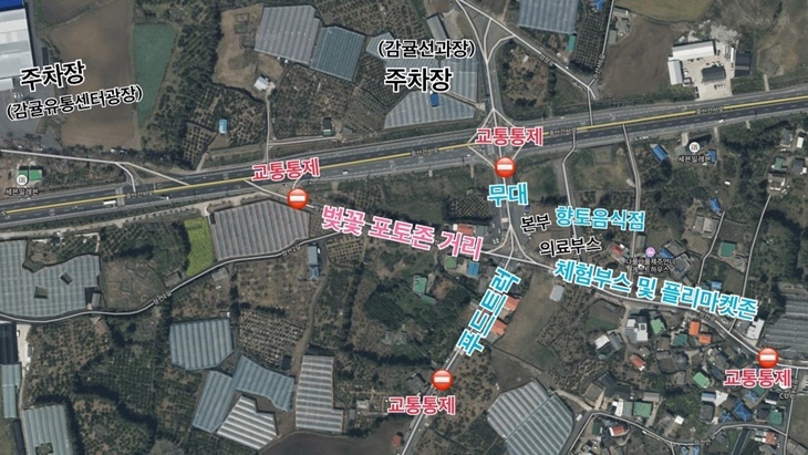 차량은 왼편 '감귤유통센터광장'이라고 표시된 곳에 주차하시면 됩니다.