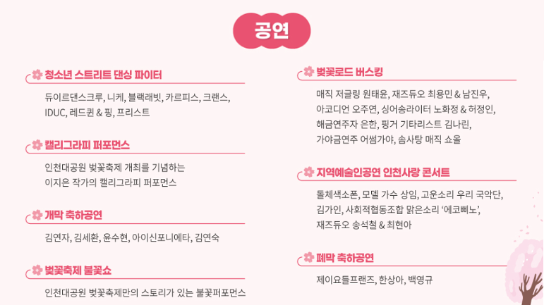 특히 인천대공원 일원에는 40년 이상 된 왕벚나무 800여 그루가 1.2km 벚꽃터널을 이루고 있어 벚꽃을 보는 재미로도 힐링의 시간을 가질 수 있습니다. 또한 김연자, 김세환 등 초대가수의 축하공연과 불꽃쇼, 버스킹, 야관 경관조명, 포토죤 등 다양한 볼거리 놀거리가 가득합니다.