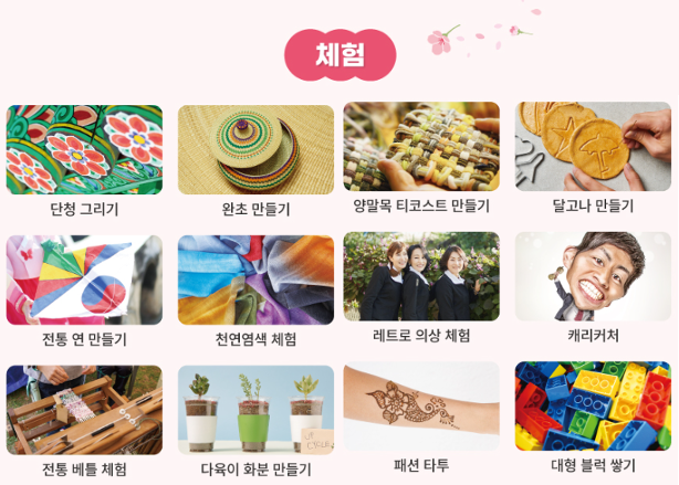 전통 연 만들기 / 천연염색 체험 / 레트로 의상 체험 / 캐리커처