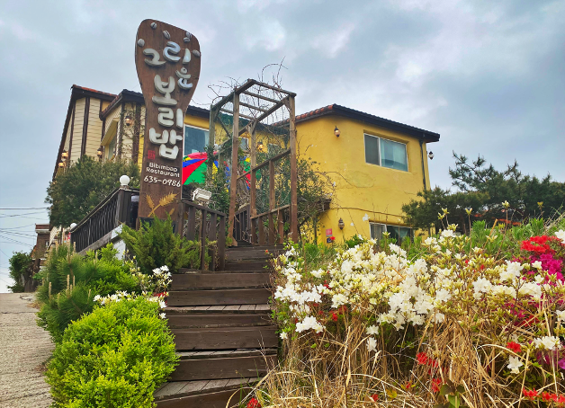 속초 시외버스 터미널 건너편 주유소 오른쪽길 큰 길로 150m 정도 걸으면 오른편 언덕 위에 보이는 2층 황토집입니다. (법원 건너편)