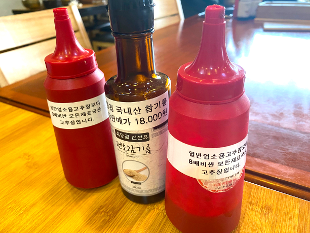 테이블에는 고추장과 참기름이 준비되어 있습니다. 그것도 국내산 참기름, 국내산 고추장입니다.