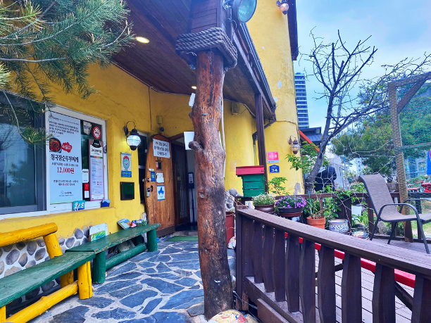 식당 입구 앞은 대기벤치도 있고 음식 소개글도 있고 테라스도 있습니다.