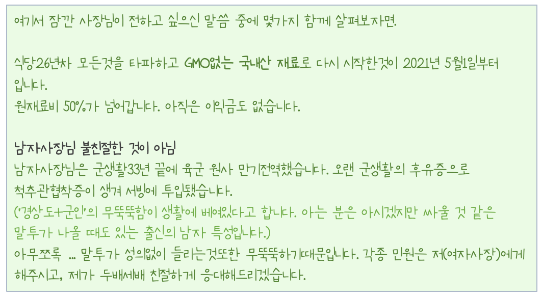 음식은 재료와 맛, 서비스, 청결 기대해도 좋아요.