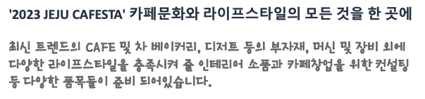 2023 제주카페스타는 제주 유일의 카페박람회이다. 최신 트렌드의 커피 및 차, 베이커리, 디저트부터 카페 창업을 위한 커피머신, 카페 인테리어, 장비 등 다양한 품목들이 준비되어 있다.