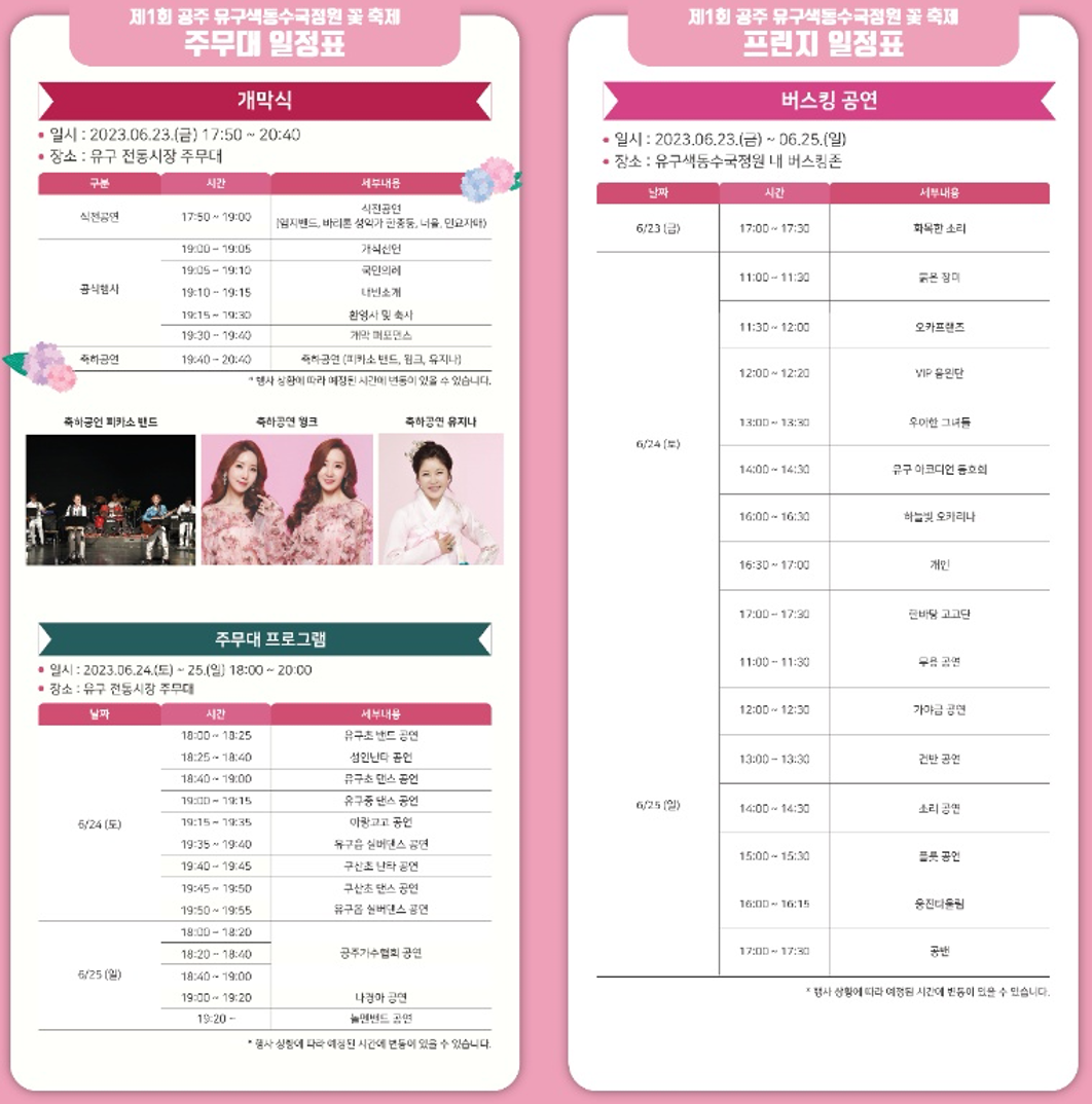 6월 23일 저녁 7시 유구전통시장 주무대에서 공식 개막식이 열리고 축제기간동안 한 여름밥의 음악회, 프린지 공연 등이 다채롭게 진행됩니다. 또한 수국정원 게이트와 은하수조명, 홀로그램 경관, 감성포토존 등 아름다운 야간경관 조명이 수국개화 기간인 7월 16일가지 정원을 밝힐 예정입니다.