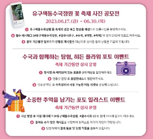특히 지난해 큰 인기를 모았던 웨딩 테마 포토존을 비롯해 가랜드, 수국우산, 가든 도어, 바람개비, 수국 팔레트, 주간 자카드 등 다양한 포토존을 설치해 잊지 못할 추억을 선사할려고 합니다.