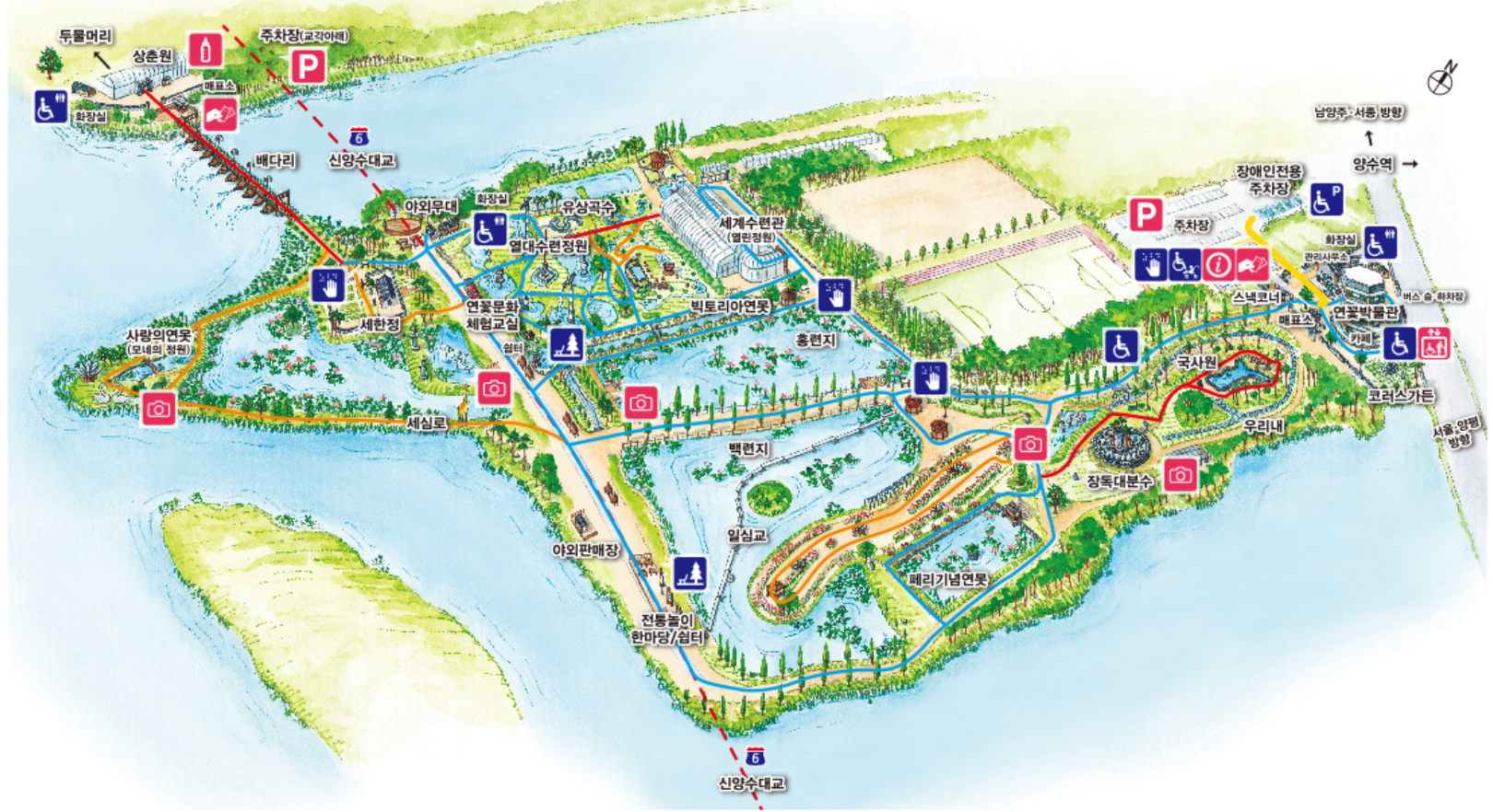 🚘승용차 : 세미원 옆 양서문화체육공원 주차장(세미원에서 1분거리)과 공영 주차장(세미원에서 걸어서 5분 거리)을 이용하실 수 있습니다.