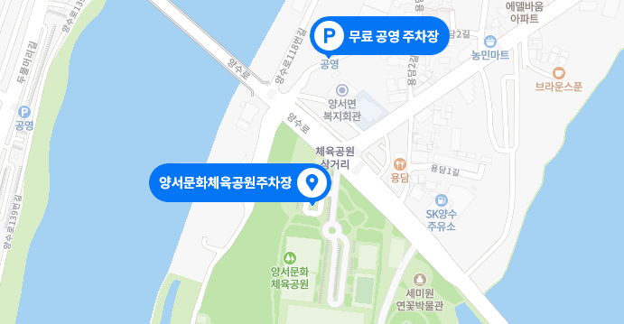 (6번국도를 타고 양평방향으로 오다가 신양수대교를 건너자마자 우측으로 진입하여 양수리 방향으로 500m 전방 양서문화체육공원 주차)