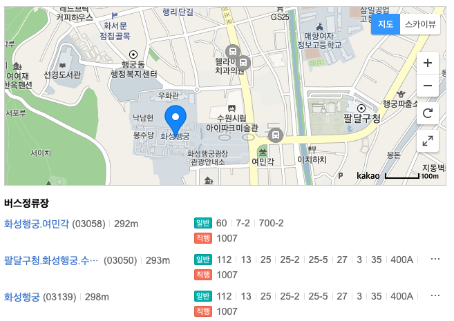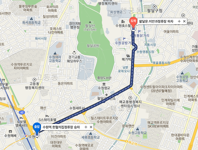 - 지하철 : 수원역 하차 후 10번출구 앞 버스 승차 -> '팔달문.이안과정류장' 하차 후 도보 이동