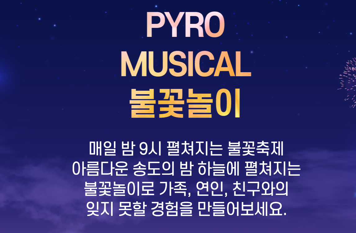 매일 밤 9시에는 음악에 맞춰 갈라 뮤직쇼 형태의 ‘Pyro Musical(파리로 뮤지컬)’ 불꽃놀이가 ‘Playing with the stars(플레잉 위더 스타즈)!’를 주제로 진행됩니다.