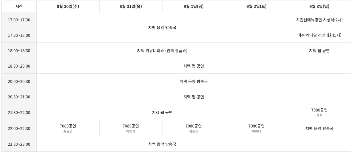 - 치맥K-POP 콘서트, 치맥EDM Party, 치맥포크 콘서트, 치맥버스킹, 초청공연