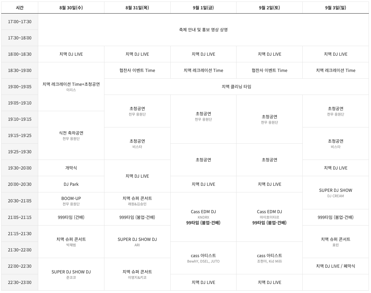 - 치맥99타임, 치맥아이스펍, 치맥아이스힐링존, 치맥시민참여이벤트, 치킨신메뉴 경연대회, 맥주칵테일쇼 경연대회