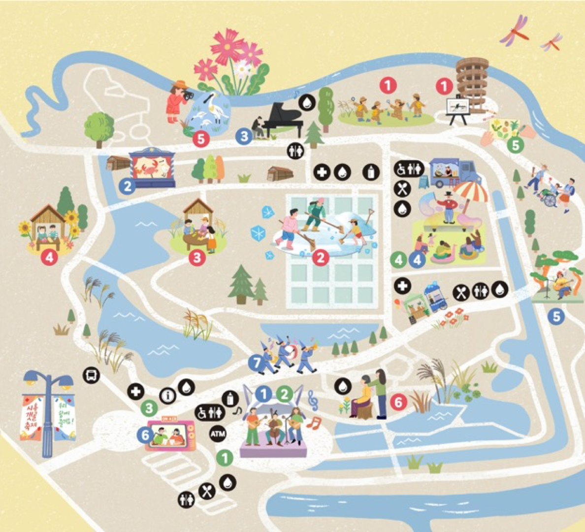 ① 어쿠스틱음악제 ② 소금창고인형극장 ③ 나무숲클래식공연장 ④ 수영장 예술극장 ⑤ 소나무통기타공연장 ⑥ 갯골DJ박스 ⑦ 갯골이동형공연