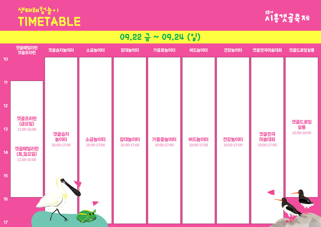 다양한 행사들이 가득한 시흥갯골축제 타임테이블을 참고하시면 더욱 알차고 재미있게 즐기실 수 있습니다.