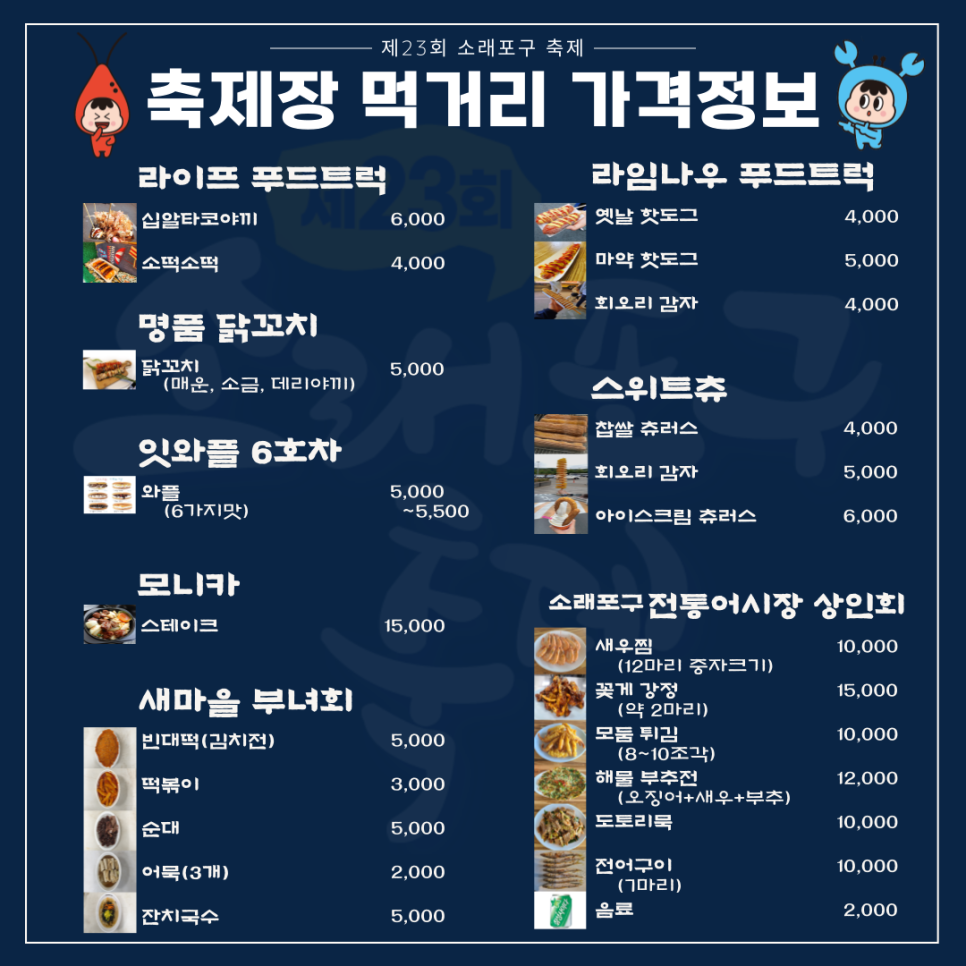 제23회 소래포구 축제에서 판매될 먹거리 가격정보를 여러분께 사전 공개합니다!