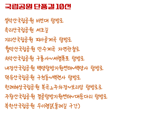 우리나라 전국 단풍 명소인 설악산·오대산·북한산·월악산·계룡산·팔공산·내장산·지리산·무등산·한라산의 최근 5년 첫 단풍 시기는 1990년대보다 평균 3일 늦춰졌습다. 이런 추세라면 앞으로 단풍시기는 점차 늦춰질 것으로 전망됩니다.