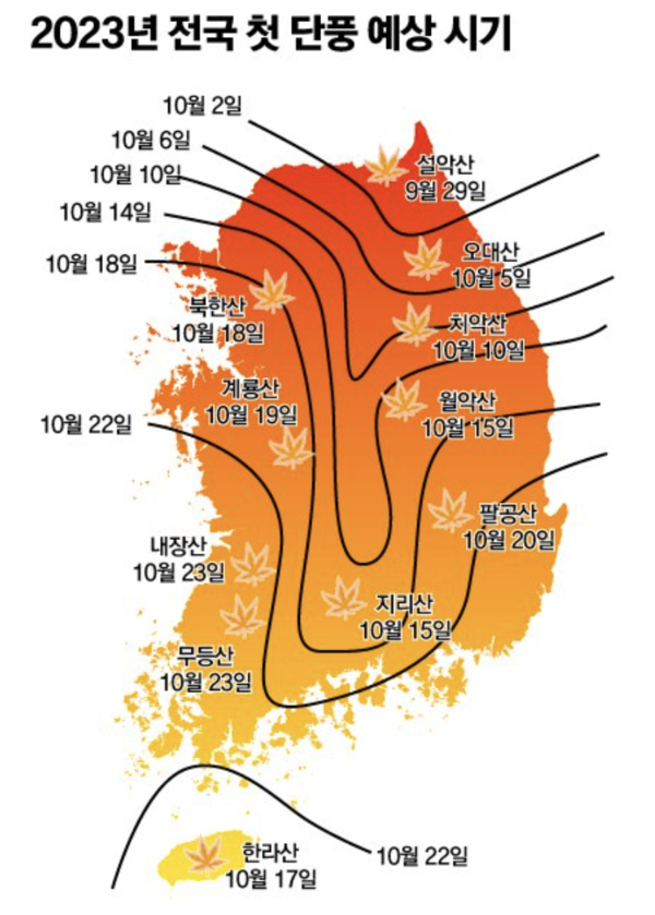 첫 단풍은 중부지방에서 29일부터 10월 19일 사이, 남부 지방은 10월 15일부터 23일 사이에 나타날 것으로 예상됩니다.