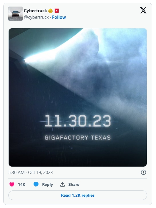 테슬라는 X의 사이버트럭 계정에 "2023년 11월30일 텍사스 기가팩토리"라고 올렸습니다.
