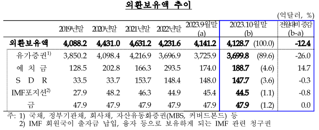 한국은행이 3일 발표한 '2023년 10월 말 외환보유액'에 따르면 지난달 말 기준 외환보유액은 4128억7000만 달러로 전월 말(4141억2000만 달러) 대비 12억4000만 달러 줄었습니다. 외환보유액은 지난 7월 4218억 달러를 기록한 이후 8월부터 3개월 연속 감소세입니다.
