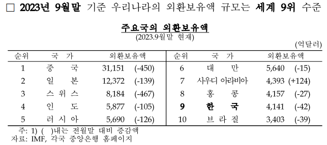 #대한민국 #한국 #한국은행 #외환보유액 #국제통화기금 #환율방어 #외환스와프 #2023년10월