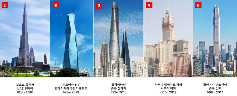 한국과 사우디아라비아가 각각 2곳씩을 보유해 뒤따랐습니다. 한국은 2000년만 해도 50대 빌딩이 한 곳도 없었으나 이번 조사에서는 롯데월드타워(554m·세계 6위)와 해운대LCT랜드마크타워(411m·37위) 두 곳으로 늘었습니다.