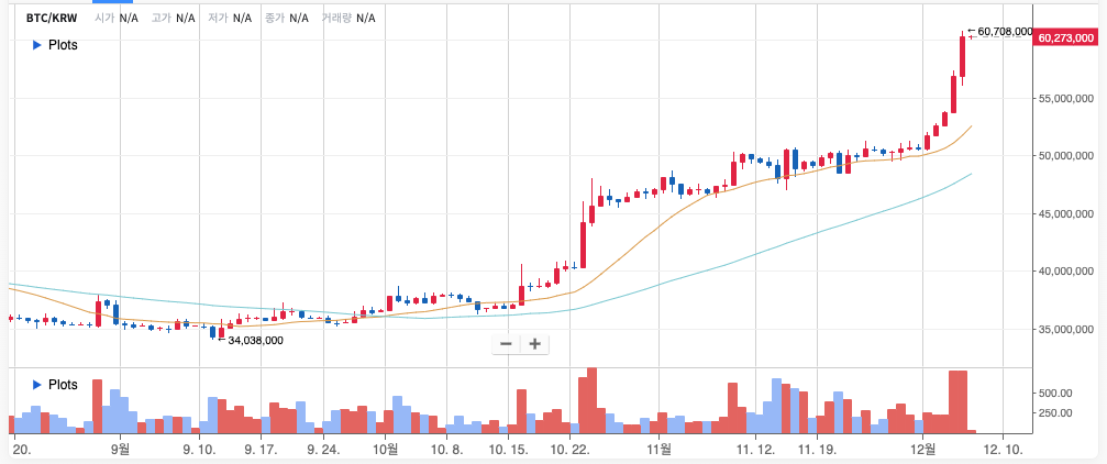 가상화폐 비트코인 또한 먼저 움직이고 있는데 한국거래소는 6천만원을 넘어섰습니다.