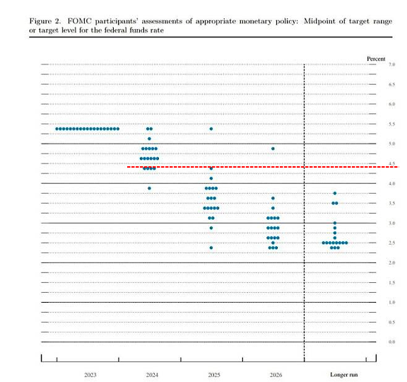 FOMC 위원 19명 중에서 가장 많은 6명은 내년 기준금리 수준을 4.5~4.75%로 예상하고 있습니다. 5명은 4.75~5.0%이었고, 4명은 4.24~4.5%였다. 가장 낮은 전망치를 제시한 1명은 3.75~4.0%였습니다.