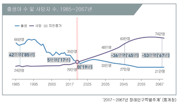 이번 장래인구특별추계결과(2019년 3월)에 따르면, 총인구는 2028년을 정점으로 2029년부터 감소하고, 2019년(2019. 7. 1. ~ 2020. 6.30.)부터 사망자가 출생아보다 많아지는 인구 자연감소가 시작될 전망하고 있습니다.