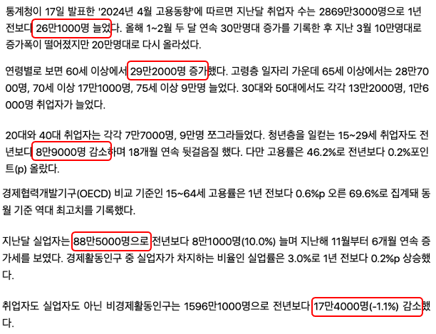 실업률에서 볼 수 있듯이 한국의 실업률은 꽤 낮은 편입니다. 24년 4월 고용동향에서 실업률은 3.0%입니다.