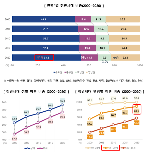 또 청년세대의 미혼 비중이 빠르게 늘어나고 있으며, 20대에서는 10명 중 9명 정도가 미혼일 정도입니다. 심각한 저출산 문제가 되는 지표이기도 합니다.