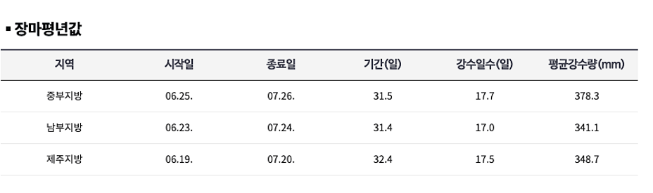 지난 2023년의 경우 중부지방의 장마기간은 6월 25일~7월 26일, 남부지방 6월 23일~7월 24일, 제주도 6월 19일~7월 20일 등이었습니다.